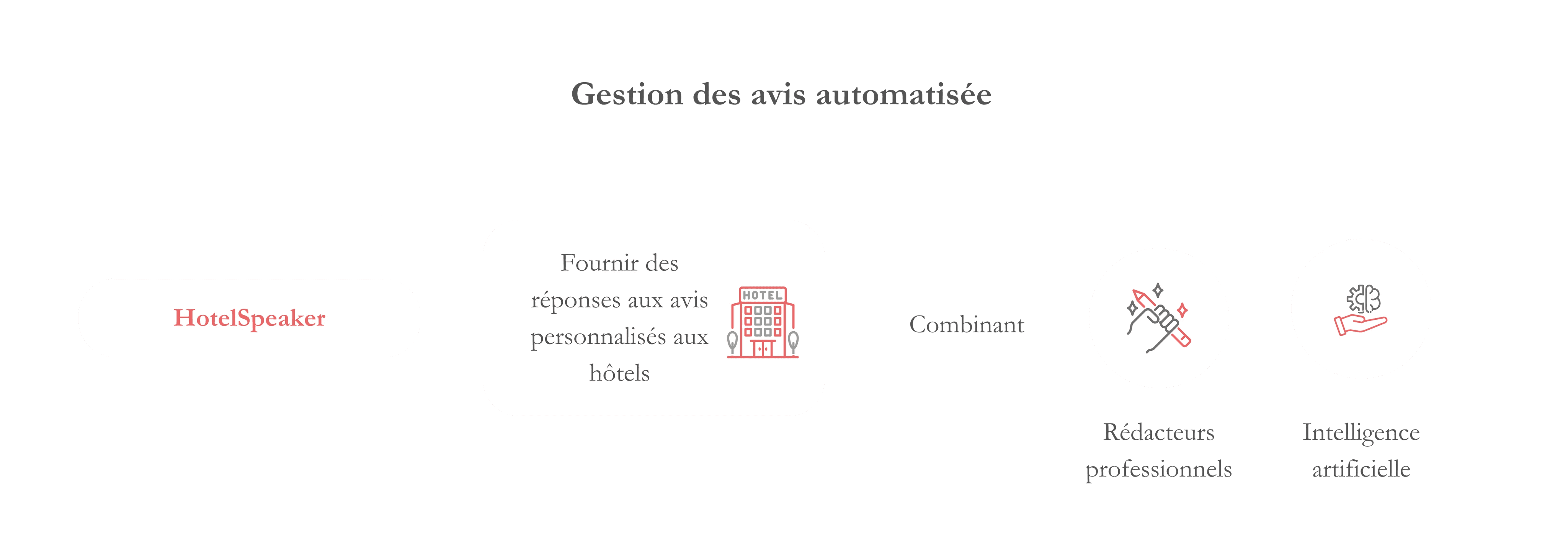 Ici, chez Hotelspeaker,, nous sommes spécialisés dans la fourniture de réponses personnalisées aux avis pour les hôtels. Notre service comprend un tableau de bord centralisé pour une gestion facile des avis. Nous élaborons des réponses personnalisées adaptées aux besoins de chaque hôtel, combinant la puissance de l'IA avec notre équipe de rédacteurs natifs maîtrisant plusieurs langues.
