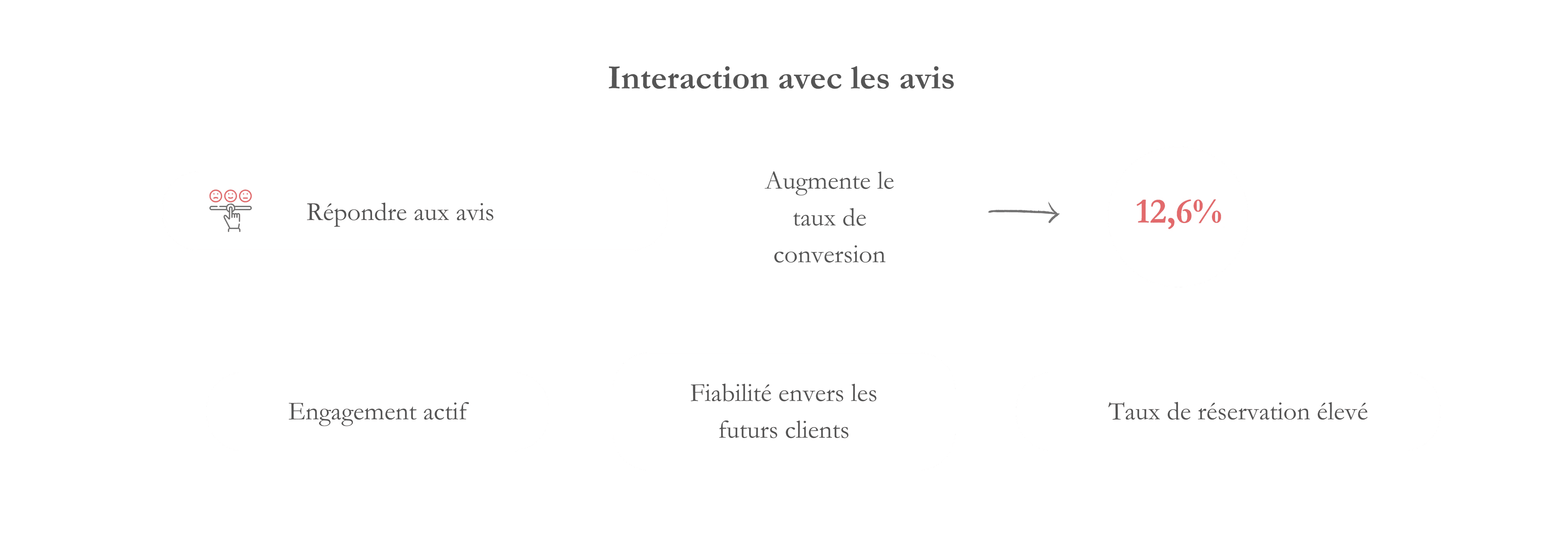 L'impact de votre score d'avis sur votre classement sur les OTA est clair, cependant, la manière dont vous gérez ces avis est encore plus importante pour influencer votre visibilité. Otamiser a recherché l'impact de la réponse aux avis sur le classement et les conversions sur les OTA. S'appuyant sur un ensemble de données robuste avec des hôtels à travers le monde, les découvertes d'Otamiser ont révélé que répondre aux avis augmente les taux de conversion de 12,6 % en moyenne.
